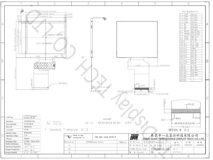 TST035QVIH-28B is a transmission type color active matrix liquid crystal display (LCD), using amorphous thin film transistor (TFT) as a switching device. This product is composed of TFT LCD panel, driver IC, FPC, PCB board, backlight, The active display area is a 70.08*52.56 measurement on the diagonal, with an active resolution of 320*RGB*240. This 3.5 inch LCD can be used to display pictures and text.