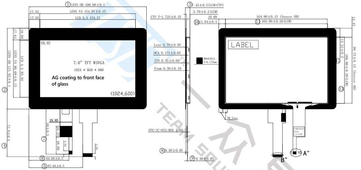 TST070WSBE-136C is 7 inch 1024*600 resolution LCD display with MIPI interface, standard brightness is 1000cd/m2. For this 7 inch TFT LCD module, Driver IC is EK79001+EK73215, viewing direction is Free. color depth is 16.7M, operating voltage is 3.3V, this lcd module can be with resistive or capacitive touch panel, customized design are also welcome. This 7 inch tft lcd is suitable used in industrial grade application.